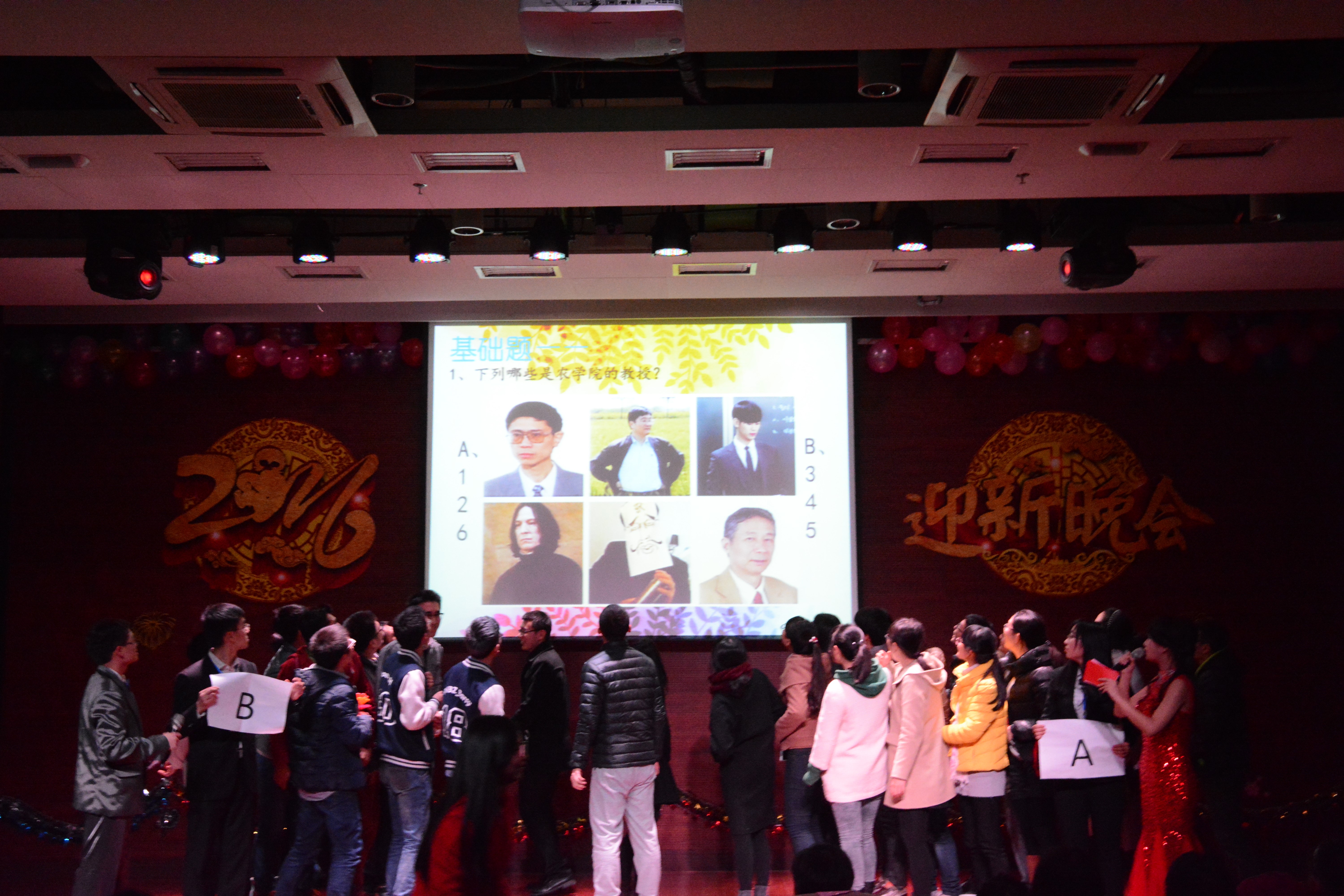 农学院2016年迎新晚会在学院学生会全体成员的大合唱《最初的梦想》中圆满落下帷幕。浙江大学学术委员会副主任刘树生,农学院院长陈学新,党委书记赵建明,副院长华跃进、王岳飞,党委副书记金敏,以及本场晚会的赞助商,浙江红五环制茶制备股份公司总经理苏中强等出席并观看了晚会,与师生共迎新年。