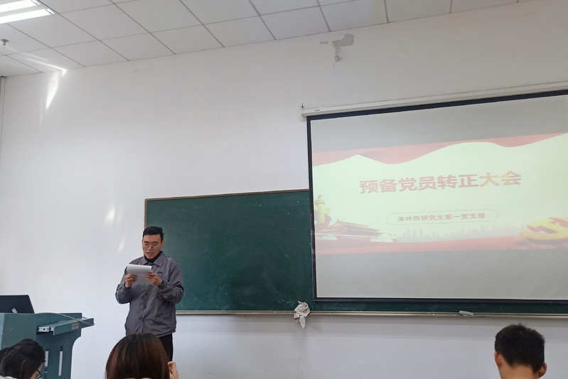 11月22日,茶叶所研究生第一党支部在农生环A座117召开党支部大会,讨论决定周森杰同志由预备党员转为正式党员的问题,会议由支部书记郝佳丽主持。