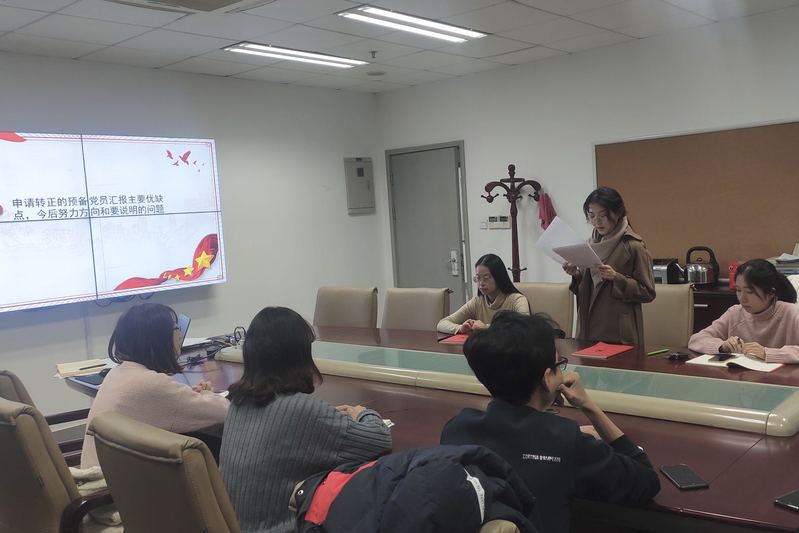 会议伊始,党支部书记张璇介绍了本次会议的流程,并对与会情况作了汇报。随后,许静雯同志从对党的认识、个人经历、入党动机以及自身优缺点等各方面进行了汇报,表明了加入中国共产党的决心和态度。其入党介绍人和支委会成员也对许静雯同志在预备期间的培养考察情况向大会做了介绍,对其在思想上、工作上和学习上取得成就表示肯定,详细分析了其目前存在的优缺点,并表明了意见。