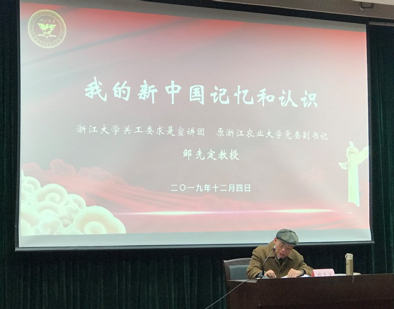12月4日下午,浙江大学关工委顾问、求是宣讲团团长、原浙江农业大学党委副书记邹先定教授给农学院百余名学生党员带来了主题为《我的新中国记忆和认识》的专题报告会。报告会由农学院辅导员潘鹏路主持。