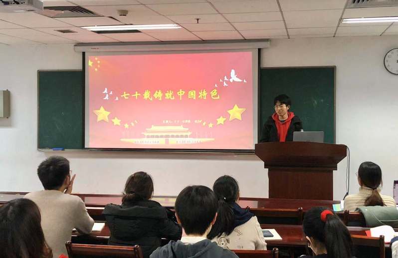 活动伊始,赵杰同学以《十九届四中全会公报》中“坚持和完善中国特色社会主义制度”为切入点,以“七十载铸就中国特色”为主题,详细地向大家介绍了新中国成立以来历届领导人为建设中国特色社会主义所做的丰功伟绩,并针对时下热点问题,与大家探讨当今中国面对的机遇与挑战。他说,中国时下正在飞速发展,而总有一些别有居心的人试图散播谣言企图阻挠中国。但历史的经验与教训告诉我们:要有自己的判断——走自己的路,让别人说去吧。赵杰同学精彩的演说获得大家的一致认同与赞扬,全场气氛也烘托到最高点。