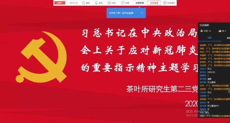 3月11日晚上,茶叶所研究生第二三党支部利用钉钉办公软件平台开展了党课学习会议。会议由党支部书记杨蕾玉主持,全体党员参与。