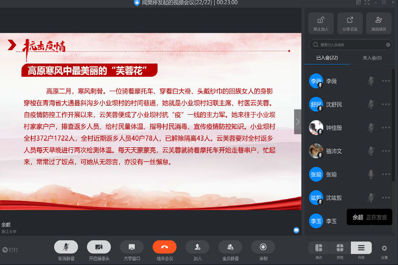 3月9日晚,核农所研究生第一、三党支部借助浙大钉平台,开展了主题为“齐心聚力共战疫情,共克时艰更显担当”的线上党课学习活动,全体支部成员参加活动。