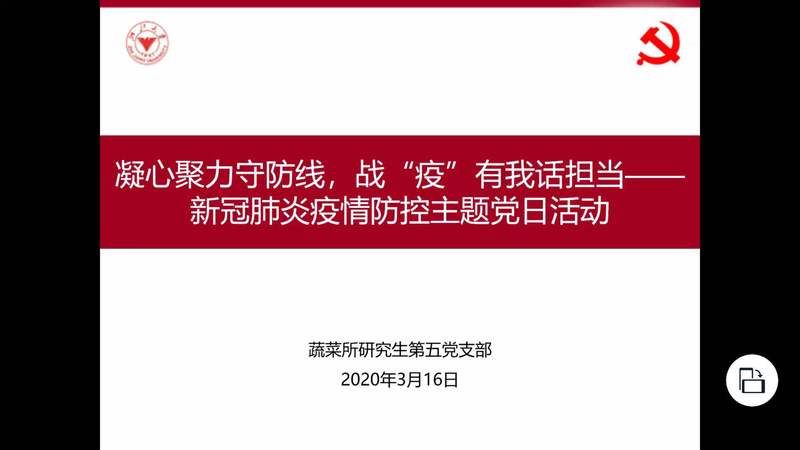 2020年3月16日晚,蔬菜所研究生第五党支部为深入学习贯彻习近平总书记在中央政治局常委会会议研究应对新型冠状病毒肺炎疫情工作时的重要指示精神,借助浙大钉网络交流平台,召开了新学期的第一次视频会议,会议由顾晓华同志主持。