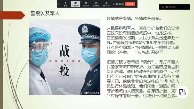 会议分为三部分,第一部分顾晓华同志带领大家回顾了党中央在疫情爆发以来的一系列防控部署工作以及重要讲话和指示,突出了“把人民群众生命安全和身体健康放在第一位”、“坚定信心、同舟共济、科学防治、精准施策”、“中西医结合,中西药并用”等一系列指导思想,明确了党中央在疫情防控过程中的先进性。随后大家也一起学习了党中央在经济、农业、保障民生等方面作出的重要决定;会议第二部分李岚同志跟大家分享了在疫情防控中涌现出的先进事迹和榜样人物,奋战在一线的医护人员,日夜坚守在工作岗位的人民警察,广大人民群体的守望相助,都让大家感受到祖国的强大和中国人民的坚强与团结,最后顾晓华同志和王羚羽同志分享了自己在疫情防控期间的志愿活动经历,述说了自己在社区管理中的所见所闻。会议最后一部分陈鑫淋同志跟大家分享了疫情期间如何提高学习效率的办法,倡议大家制定严格的作息时间表、制定合理的学习计划、善于利用网络资源、建立有效的约束机制,希望大家养成良好的学习习惯和生活节奏。