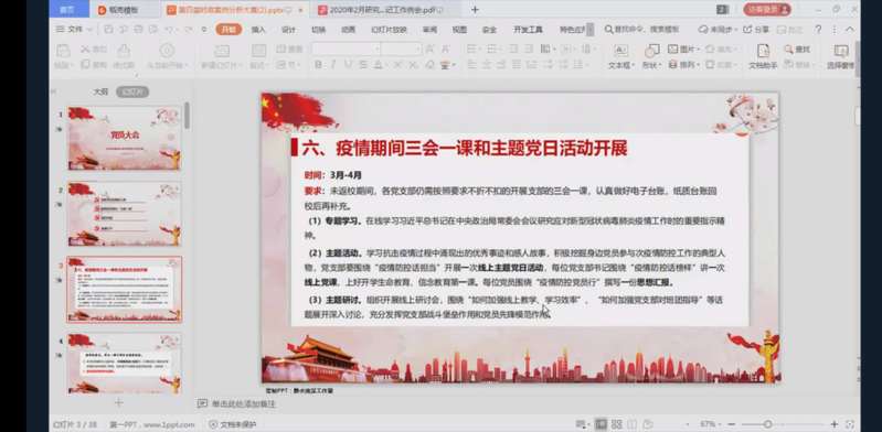 会议首先,蔡雅洁书记简要说明了疫情期间支部仍应完成三会一课制度和主题党日活动的开展,党员在党课结束后撰写思想汇报,参与主题研讨等等情况。接着,就同学们存在的线上打卡和返校问题进行了线上答疑,并告诫大家少出门,为抗击疫情献力。