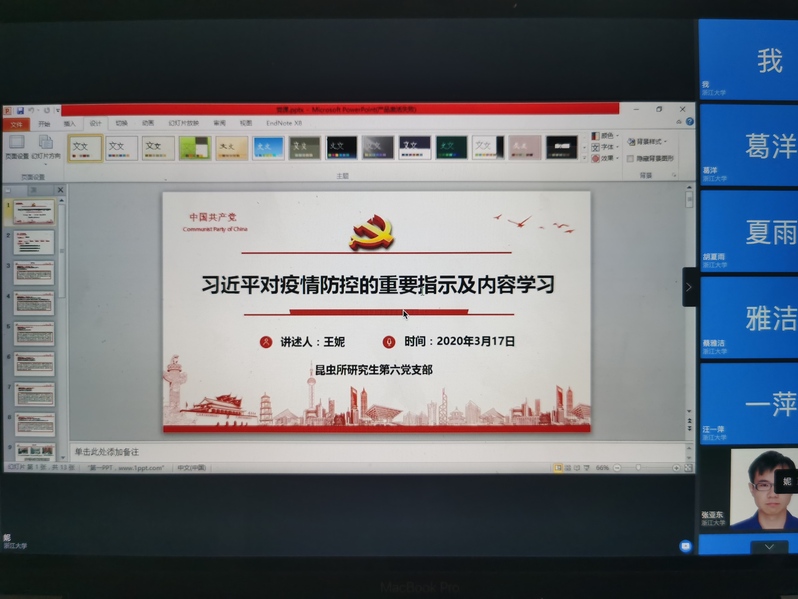 3月17日下午,昆虫所研究生第六党支部在线上进行了习近平对疫情防控的重要指示及内容的党课学习及线上学习经验分享。党课由王妮同志主讲,学习经验分享由周琪欢同志主持。