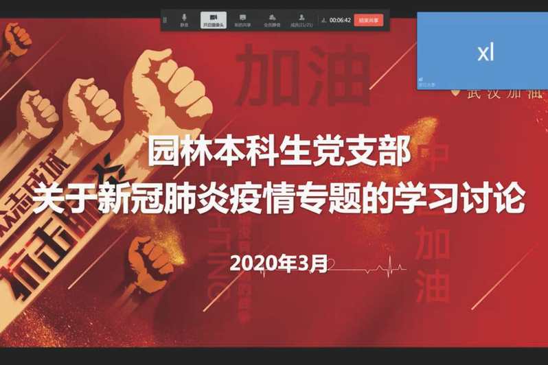 3月31日晚,浙江大学农学院园林本科生党支部借助浙大钉学习平台开展了关于新冠肺炎疫情专题学习讨论的线上支部会议。本次会议由党支部书记吴旻老师主持,党支部党员共21人参加。