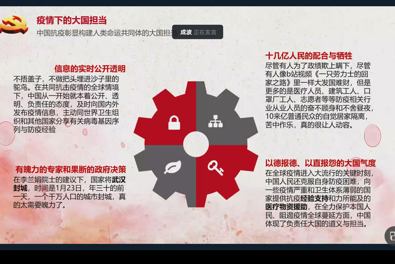 会议分两部分进行,在主题党课中,成波同志从四个方面对当前新冠病毒引起的肺炎疫情的相关内容进行了讲解。现阶段,我国的疫情防控在全国人民的努力下,取得了一定的成果,本土疫情基本阻断,我们可以看到,这是党领导的充分优势。但随着国外疫情的爆发,我国境外输入病例不断增加,我国及世界的疫情仍处于不能放松的吃紧阶段。接着,成波同志借助波兰球漫画同大家一起回顾了疫情的发展,并讲述了在这场疫情下,中国的大国担当。信息的实时公开透明,十几亿人的配合与牺牲,有魄力的专家和果断的政府决策,以德报德、以直报怨的大国气度,我们可以看到,中国抗“疫”彰显的是构建人类命运共同体的大国担当!