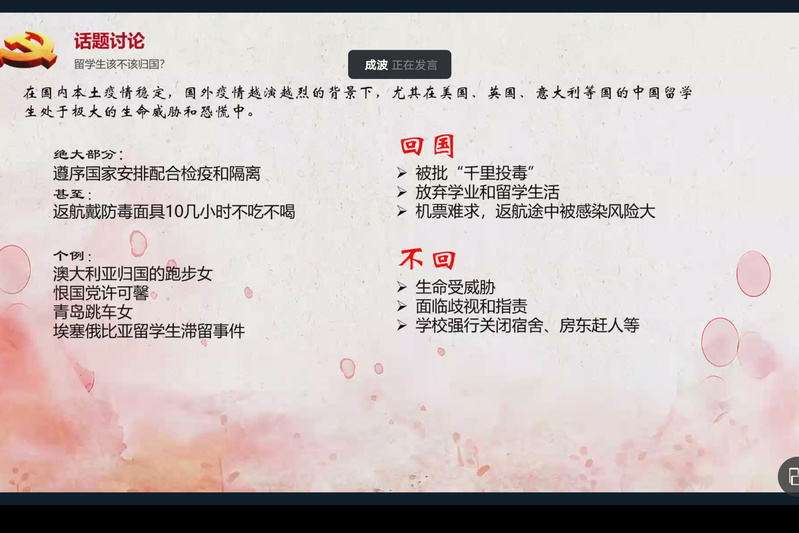 会议的第二部分是组织生活会,在当前国内本土疫情基本稳定,国际疫情愈演愈烈的背景下,党员同志们就“如果你是留学生,你会怎么选择”一题进行了辩论。大多数党员同学均持“不回国”观点,非极端情况下会选择“不回国”,黄丹同志从六个方面进行了利弊的分析;王岳同志则认为,并不是“回国了就是在给国家添乱”,这其中可能夹杂了父母情感等多种因素。疫情发生后,全国人民都在努力,我们不能因为一些留学生的负面个例给整个留学生群体贴上标签,权衡利弊,加强防护,相信祖国,我们每个人都会是这场战“疫”中最勇敢的战士。