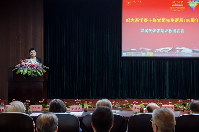 开幕式后是纪念茶学泰斗张堂恒先生诞辰100周年活动。农学院党委书记赵建明先生介绍了张堂恒先生生平与功绩。张堂恒先生是著名的茶学家、制茶与审评专家,也是茶学国家重点学科第一任学科带头人、我国茶学学科第一位博士生导师,培养了大批茶学人才,为茶学教育事业做出重要贡献。张堂恒先生培养出英才们也都来到现场缅怀恩师,其中龚淑英教授、许心青先生作为代表上台追忆与张先生的点点滴滴。老教师代表刘祖生教授、校友代表程启坤先生和家属代表张是求教授也分别上台发言,从各个角度再现出了一代宗师的独特魅力。