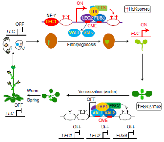 一些越冬植物必须经历一段时间的持续低温(寒冬)才能在春季时开花,这种现象即为春化作用。春化作用受表观遗传调控,在模式植物拟南芥中,长期低温通过染色质修饰(组蛋白H3 第27位赖氨酸三甲基化,H3K27me3)关闭抑制开花的关键基因FLC。2017年11月陶增博士以第一作者发表在Nature的研究成果表明“春化记忆”重置发生在胚胎发育早期,种子特异的“先驱”转录因子 LEC1在受精后启动了这一重置过程,以重新激活FLC表达。