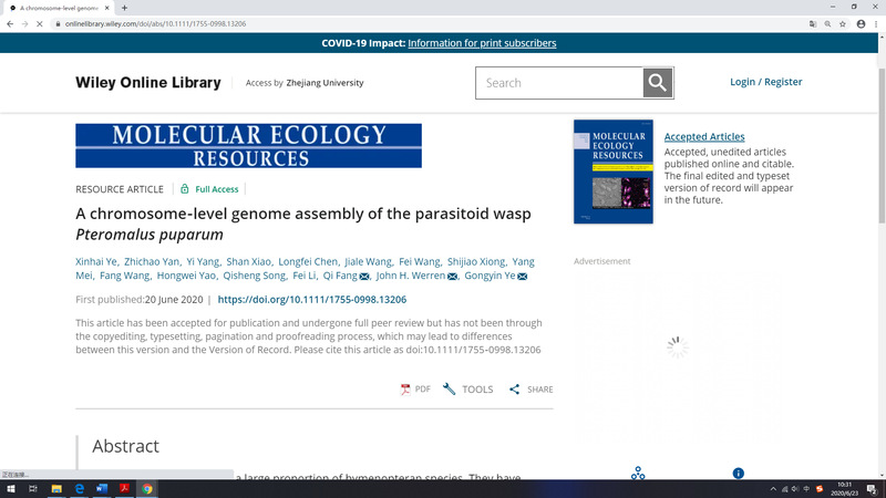 农学院昆虫科学研究所叶恭银教授团队采用Illumina短读长、PacBio长读长以及Hi-C辅助组装技术相结合的方法,完成对蝶蛹金小蜂基因组高质量测序及染色体水平组装。该研究成果于2020年06月20日在国际知名分子生态学期刊《Molecular Ecology Resources》在线发表。博士生叶昕海、严智超博士、博士生杨义为论文共同第一作者,浙江大学叶恭银教授与方琦副教授、美国罗彻斯特大学John H. Werren教授为本文共同通讯作者。此外,浙江大学李飞教授、姚洪渭副教授及美国密苏里大学宋齐生教授等亦共同参与完成此项研究工作。该研究工作得到国家自然科学基金重点国际(地区)合作研究项目、国家自然科学基金重点项目等资助。