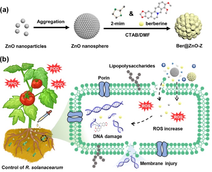 植物源天然产物小檗碱虽然能通过抑制青枯病菌DNA复制、RNA转录而达到防治效果,但小檗碱很难直接渗透到细胞质中,因此其药效欠佳、起效较慢。本研究通过原位生长法制备了一种具有核壳结构的ZnO@ZIF-8纳米球。结果表明,负载小檗碱的Ber@ZnO-ZIF-8,既能诱导大量活性氧(ROS)的生成,造成细菌DNA的损伤、细胞质的泄漏和细胞膜通透性的改变,同时在易诱发青枯病的酸性环境中快速释放的小檗碱更易渗透进细菌体内与DNA结合,从而产生高效的协同杀菌作用。体外生测显示,该纳米复合物在减少小檗碱15倍用量的前提下,相比小檗碱原药的活性依然能够提高4.2倍,具有显著的增效作用,且盆栽实验发现该体系能够有效地延缓番茄青枯病的发病时间、减少发病率。该研究为土传细菌病害的高效防治、智能释放农药新制剂的设计、农业可持续发展提供了新启示。