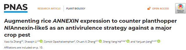 2025年10月9日,浙江大学张传溪教授团队,杜克大学Sheng Yang He院士(美国科学院)团队和云南大学姜艳娟研究员团队合作在《Proceedings of the National Academy of Sciences of the United States of America》期刊发表题为“Augmenting rice ANNEXIN expression to counter planthopper NlANNEXIN-like5 as an antivirulence strategy against a major crop pest”的研究论文。该论文报道了增强水稻膜联蛋白表达可以对抗褐飞虱的NlANNEXIN-like5(NlANX5)毒力因子,可作为抗作物害虫的新型防控策略。