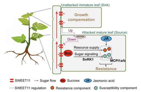 在虫害后,对全株不同组织的糖分流动的时空动态追踪发现,虫害促进了幼叶(库叶)中的糖分输入,而抑制了成熟叶(源叶)的糖分输出。通过比较转录组分析,该研究找到了一个糖转运蛋白SWEET11,它是虫害后不同组织间糖转运(源库关系)的关键调节因子,并能介导上述的组织特异性防御反应。具体表现在:植株成熟叶(源叶)受块茎蛾虫害后,SWEET11在幼叶(库叶)中的表达被快速上调,从而促进其他组织的糖分向幼叶输入,并提供足够的能源实现幼叶的生长补偿;同时,SWEET11基因在受虫害的成熟叶(源叶)中的表达被快速下调,从而抑制糖分从成熟叶向其他组织输出,而截流下来的糖分则能增强成熟叶对害虫的抗性。