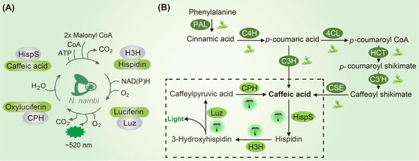 早期植物生物发光研究曾面临关键瓶颈。例如,20世纪80年代将萤火虫荧光素酶导入烟草的尝试,虽实现初步发光,却因亮度微弱且需持续添加昂贵外源底物而难以广泛应用。真菌生物发光途径(FBP)的发现从根本上突破了这一局限。该途径源自发光蘑菇(如Neonothopanus nambi),其核心是由四个酶(HispS、H3H、Luz与CPH)构成的代谢循环。该系统以植物体内天然存在的咖啡酸为起始底物,经HispS催化生成hispidin,再由H3H转化为最终发光底物3-羟基hispidin;随后,Luz催化其氧化,发射出波长约520纳米的绿光。尤为关键的是,反应产物caffeylpyruvic acid可被CPH水解并重新生成咖啡酸,从而形成一个自我维持的封闭代谢循环。这一内在的自主性使FBP能够在植物中实现全生命周期持续发光,无需任何外源底物投入,因此在异源表达系统中展现出显著优于传统发光体系的实用优势(图1)。
