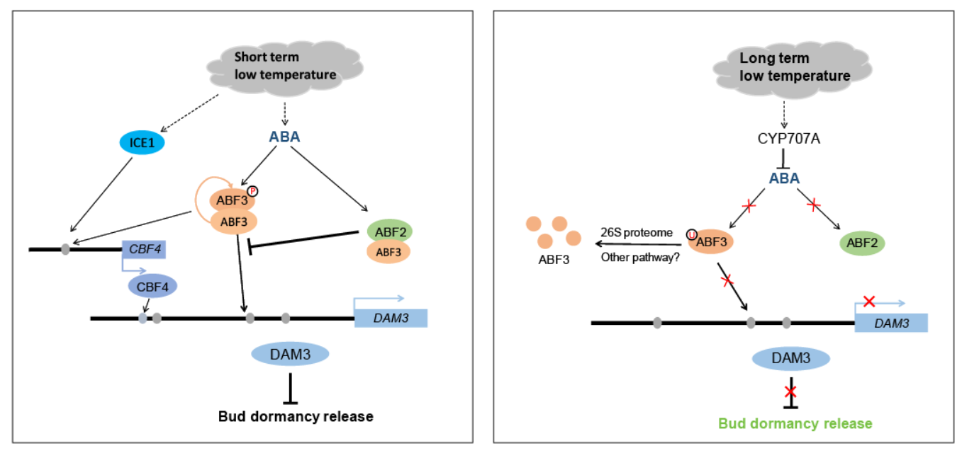 On February 24, 2020, Plant, Cell & Environmentpublished online a research article entitled “ABA-responsive ABRE-BINDING FACTOR3 activates DAM3 expression to promote bud dormancy in Asian pear” by the group of Professor Yuanwen Teng. The study confirmed that ABA promotes bud dormancy maintenance and regulates the expression of DAM gene. An ABA-responsive transcription factor PpyABF3 was identified as its expression pattern was similar to that of PpyDAM3 gene. A set of biochemical experiments verified that PpyABF3 activates PpyDAM3 expression. PpyABF2 however, could interact with PpyABF3 and disrupt the binding and activation of PpyABF3 to PpyDAM3 promoter. The results demonstrate that ABA maintains the dormancy status via precisely regulating DAM gene. After long-term exposure to low temperature, PpyCYP707A3 is up-regulated, promoting the decrease of ABA content, leading to the down-regulation of PpyDAM3 and dormancy release. This research clarify the finely tuned regulatory mechanism underlying the effect of ABA on DAM gene expression and provide new insights into ABA-related bud dormancy regulation.