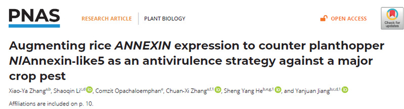 2025年10月9日,浙江大学张传溪教授团队,杜克大学Sheng Yang He院士(美国科学院)团队和云南大学姜艳娟研究员团队合作在《Proceedings of the National Academy of Sciences of the United States of America》期刊发表题为“Augmenting rice ANNEXIN expression to counter planthopper NlANNEXIN-like5 as an antivirulence strategy against a major crop pest”的研究论文。该论文报道了增强水稻膜联蛋白表达可以对抗褐飞虱的NlANNEXIN-like5(NlANX5)毒力因子,可作为抗作物害虫的新型防控策略。