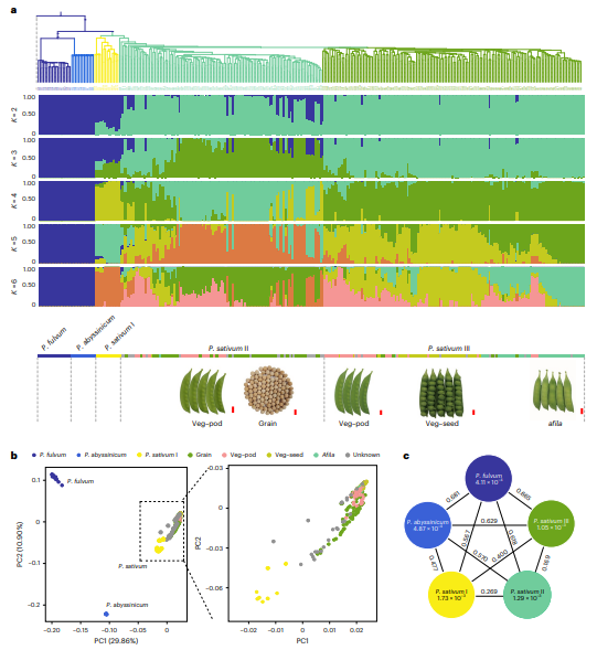 2024年8月5日,张明方教授等团队联合浙江省农业科学院龚亚明研究员团队在国际遗传学顶级期刊Nature Genetics发表了“Reference genome sequence and population genomic analysis of peas provide insights into the genetic basis of Mendelian and other agronomic traits”的研究论文,首次揭示了菜用豌豆与粮用豌豆分化的基因组遗传基础,并对孟德尔性状在内的57个重要农艺性状相关基因进行了系统分析鉴定,研究结果为豌豆种质创新提供强大的组学大数据基础和基因组育种新策略。