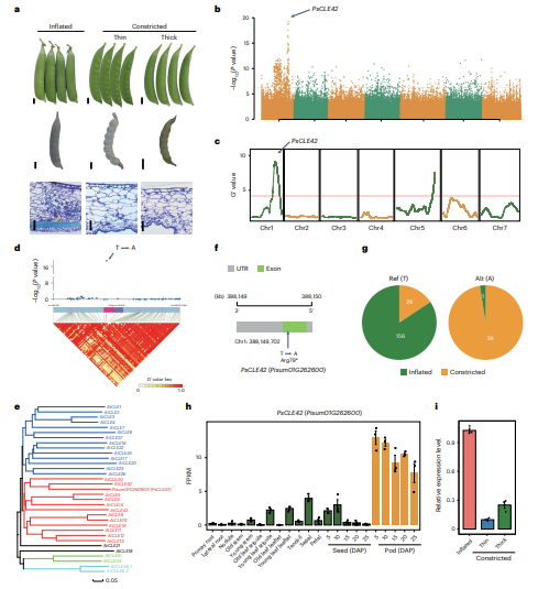 图2 豌豆遗传变异图谱和群体遗传结构解析 同时还完成了237份豌豆核心种质57个重要农艺性状连续两年的表型精准鉴定,覆盖了籽粒、豆荚、叶片、花、茎、产量、熟期、抗逆、抗病性等相关性状。首次在豌豆上开展大规模GWAS分析挖掘重要性状基因,在全基因组范围内共鉴定到235个候选位点。对孟德尔性状茎长(Le/le)、花色(A/a)、子叶色(I/i)和种子形状(R/r)的关键基因及变异位点进行了系统解析(图3)。同时重点对尚未被发现的孟德尔性状‘豆荚形状’和种脐颜色性状基因进行了分析鉴定,发现CLAVATA3/Embryo Surrounding Region-related(CLE)基因PsCLE42 外显子上一个从T到A的碱基突变导致翻译提前终止,可能与豆荚形状变异有关(图4);推测多酚氧化酶基因PsPPO1外显子上一个碱基缺失导致移码突变从而产生白色种脐性状。