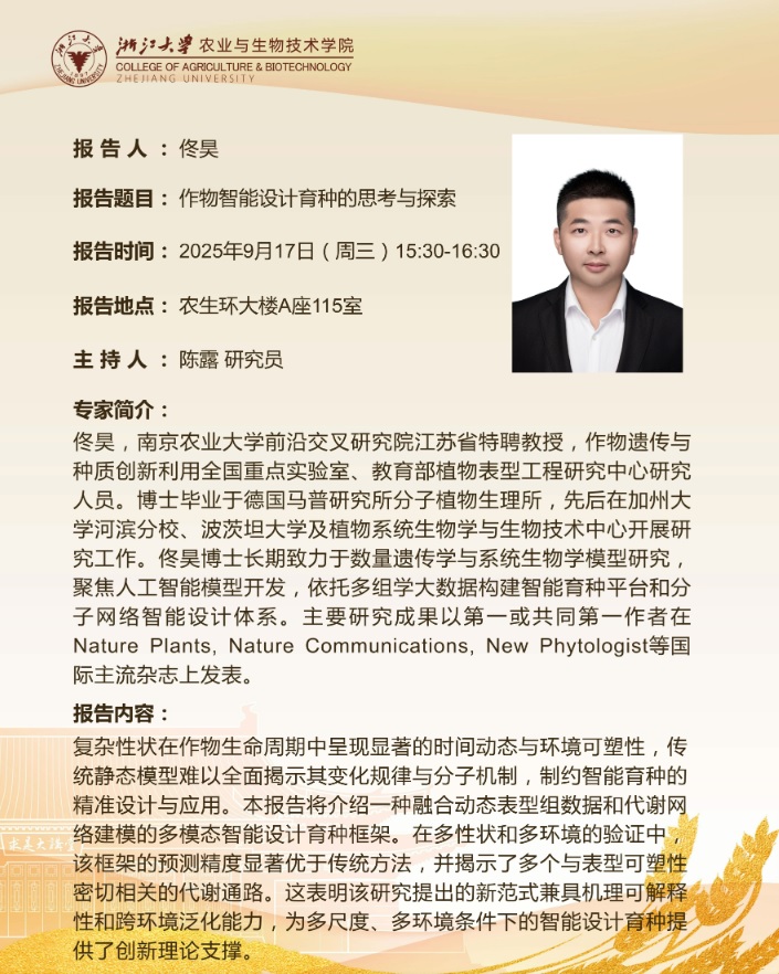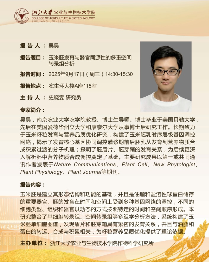 2025-09-17 题目:1.植物智能设计育种的思考与探索;2.玉米胚发育与器官同源性的多重空间转录组分析