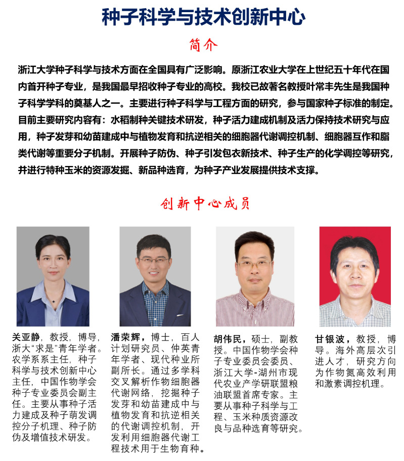 研究耐旱、耐寒与多胺代谢关系、代谢途径以及调控机制,寻找调控种子质量的新途径;进行种子包衣,种子引发,种子质量控制,种子生产的化学调控,种子活 力,种子贮藏,种子检验的研究;研究核心种质构建的方法,开展水稻特异种质资源评价和利用研究,为高效、合理利用植物种质资源提供理论和技术支撑;参与全 国农作物种子标准化技术委员会工作,参与国家种子检验规程、种子贮藏标准、种子包装标准等的制定,推动种子工程的实施。本方向是农业部的种子科技培训基地,在国内最早开始培养种子科学硕士生,是全国唯一招收种子科学博士生的学科点。该研究领域现有教授2名。